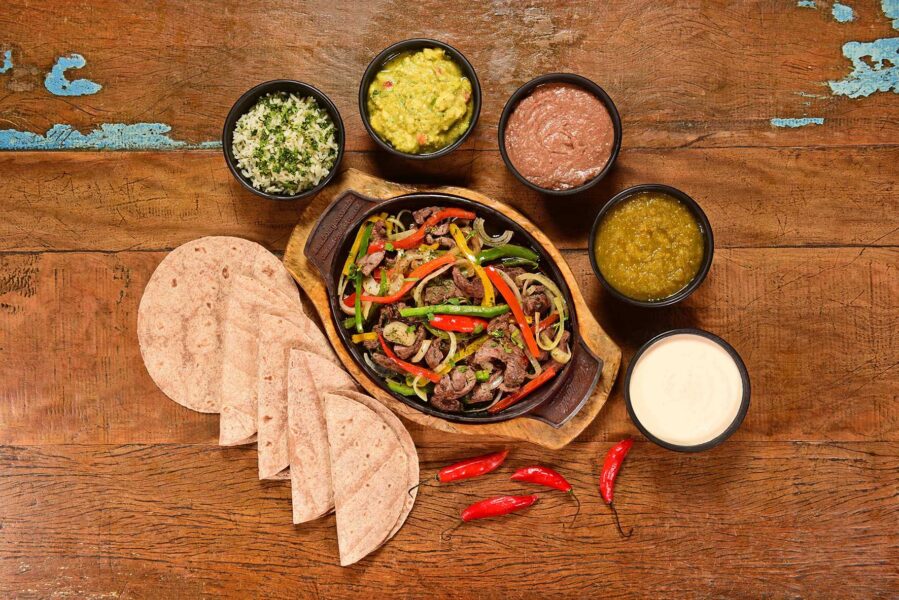 O prato é acompanhado de arroz, pasta de feijões refritos, molho sour cream, guacamole e salsa picante (molho à base de tomate ). Quem aprecia carnes, pode escolher entre o Mignon (R$ 120 na versão individual e R$ 190 para duas pessoas) ou de Frango (individual a R$ 99, para dois a R$ 120). A opção vegetariana vem com abobrinha, acelga, tomates cereja e cogumelos – sai R$ 59 para uma pessoa ou R$ 79 para duas.