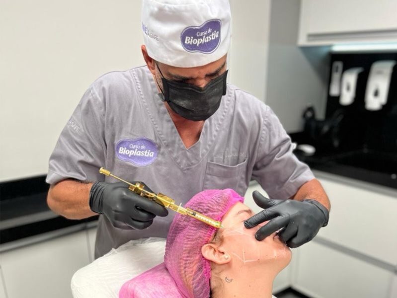 O médico destaca que o procedimento é minimamente invasivo, realizado através de um pequeno furo na pele por onde a microcânula é introduzida e, com a pistola de aplicação, o produto é direcionado para o plano desejado.