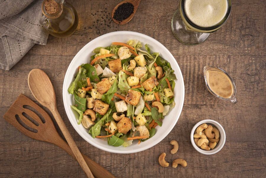 SEXTA-FEIRA, SÁBADO E DOMINGO: Dadinhos de Tapioca – Alface americana e roxa, rúcula, croutons, cenoura, abacaxi, gergelim negro, castanha de caju, dadinhos de tapioca e molho asiático.