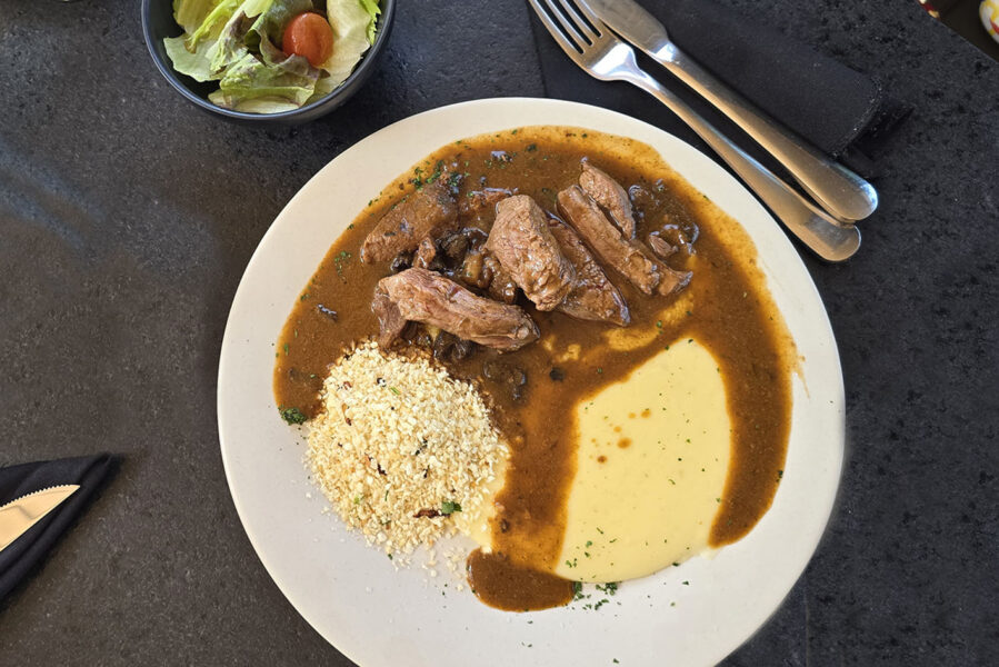 Todas as proteínas são servidas com três acompanhamentos, a serem escolhidos entre: arroz branco, feijão, farofa crocante, legumes grelhados, salada do dia, purê de batata, batata frita, legumes no vapor com manteiga e ervas e, por fim, massa na manteiga.