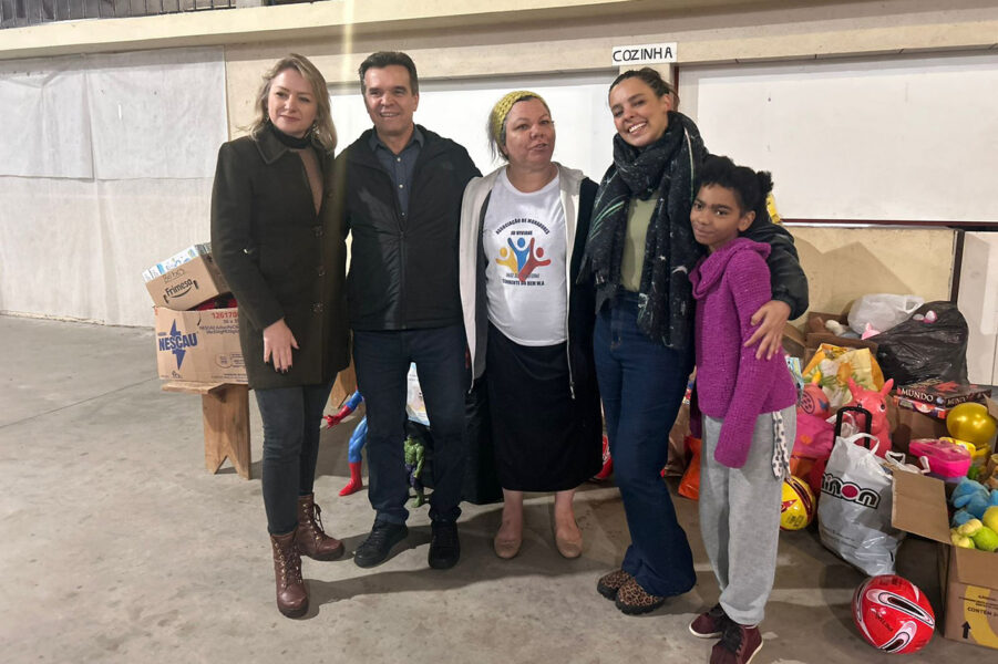 Na foto, a presidente da Associação de Moradores, Madalena Moraes (ao centro), recebe a doação ao lado da head financeira da Vila Katu, Simone Grochoski, do Prefeito de Campo Magro, Bozinha, e da head de operações da Vila, Jordana Pimentel.