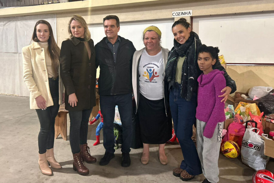 Na foto, a presidente da Associação de Moradores, Madalena Moraes (ao centro), recebe a doação ao lado da head financeira da Vila Katu, Simone Grochoski, do Prefeito de Campo Magro, Bozinha, e da head de operações da Vila, Jordana Pimentel.
