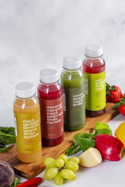 Os novos sucos combinam frutas, vegetais e especiarias 100% naturais. Todos tem o mesmo preço (R$ 16) e são apresentados em garrafinhas de 300ml. Duas opções contam com quatro ingredientes. A primeira mescla uva, beterraba, limão e maçã. A segunda, couve, abacaxi, maçã e limão.