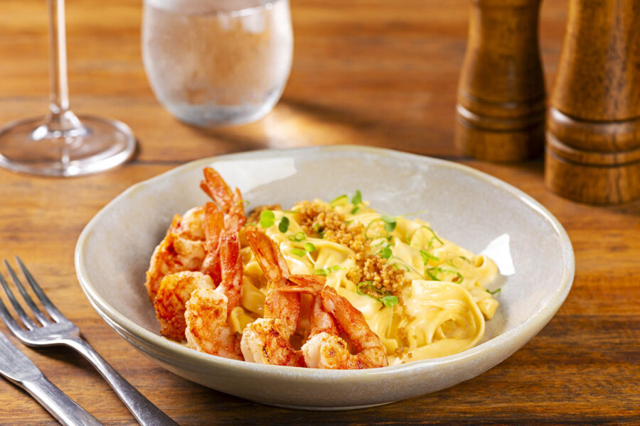 O segundo prato de verão também é preparado na brasa: Camarões grelhados na parrilla. Os cobiçados crustáceos são temperados com páprica defumada e servidos com fettuccine. O molho da massa, por sua vez, leva creme de leite, flambado com cachaça, e leva manteiga de bisque e limão siciliano. Para finalizar, o fettuccine é coberto com cuscuz marroquino hidratado no curry e frito como se fosse um pangrattato italiano, para adicionar textura e sabor. O preço é R$ 129.