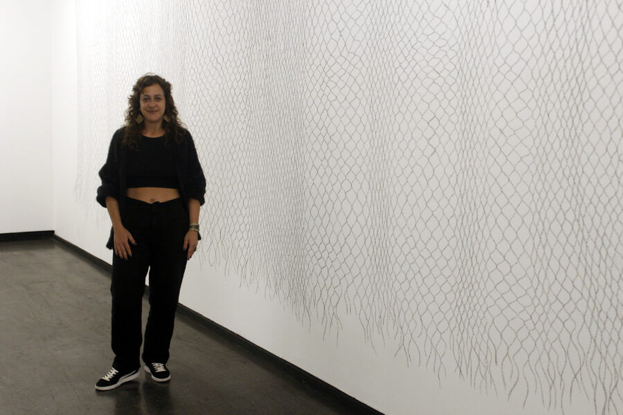 Já na produção de Lailana Krinski, o corpo surge em situações incomuns, muitas vezes acoplado a objetos ou elementos do cotidiano, criando imagens compactas e enunciativas que tensionam dimensões físicas, psíquicas e culturais do corpo feminino contemporâneo. A artista também apresenta na mostra trabalhos da série “Está tudo desfeito entre nós”, em que investiga questões de estrutura, gesto e processo no campo do desenho. Apesar do título sugerir ruptura, a série opera na ambiguidade entre fazer e desfazer: linhas se entrelaçam sem formar nós, compondo uma trama delicada, como uma rede de gestos em movimento.